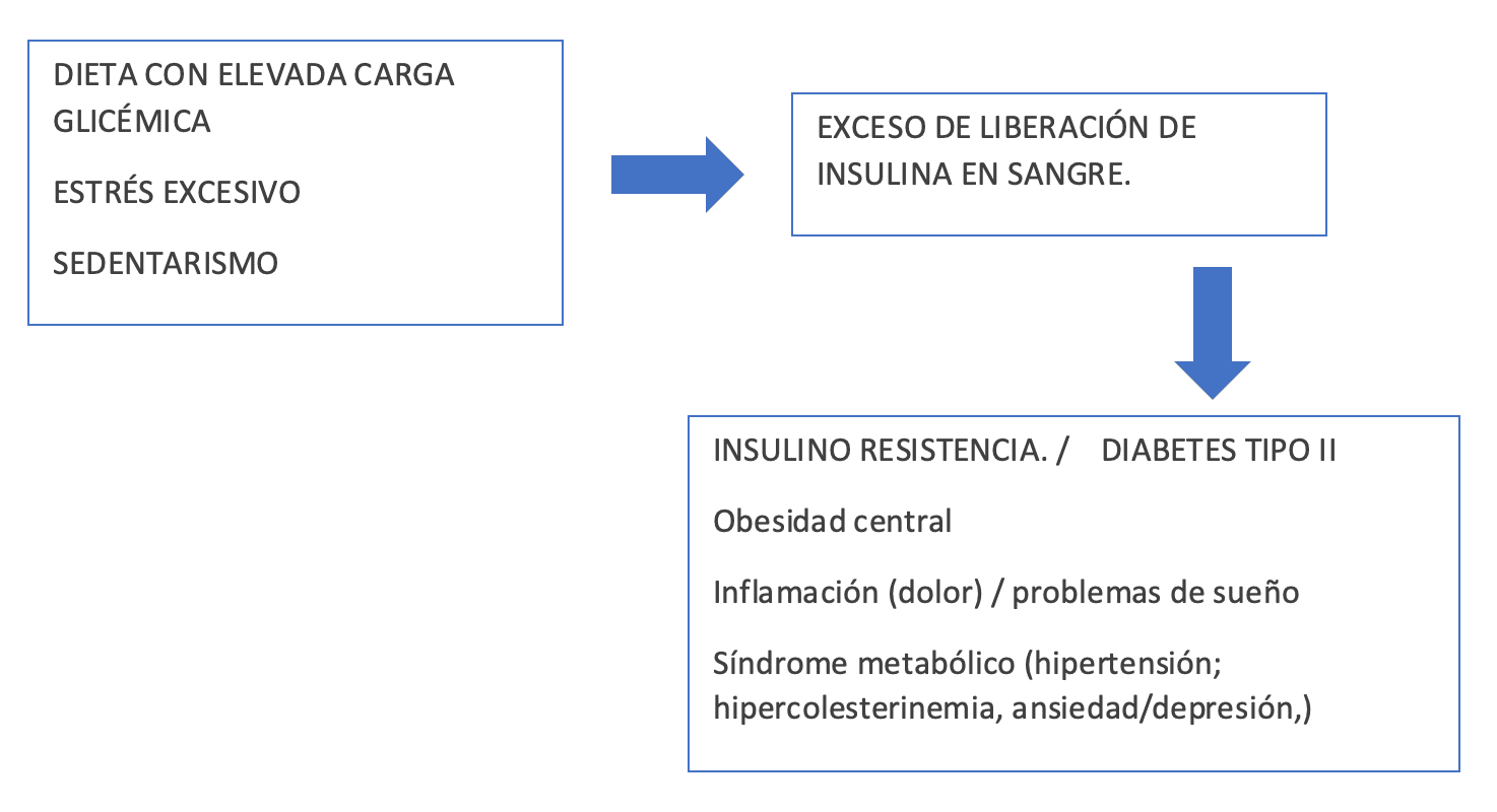 Como se ha podido leer ya en innumerables artículos y publicaciones científicas, la manera de comer en el primer mundo caracterizada por basar como fuente calórica principal alimentos con alta carga glicémica* (cereales refinados o no, lácteos más o menos industriales, dulces y alimentos ultra procesados), nuestro ritmo de vida acelerado que condiciona altos niveles de estrés y por lo tanto de hormonas del estrés** (cortisol, adrenalina,…) que también favorecen un aumento de los niveles de insulina en el cuerpo. Todo esto se ve potenciado por el sedentarismo predominante en nuestra sociedad, ya que manteniendo la musculatura inactiva no activamos uno de los mecanismos reguladores de los niveles de glucosa circulante.