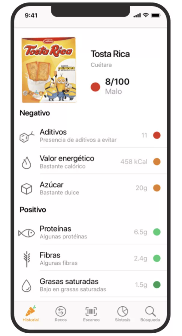 La app gratuita Yuka te sirve para escanear con tu móvil los productos alimentarios y descifrar sus etiquetas. De esta forma, podrás ver (por pequeña que sea la letra de la etiqueta…) los ingredientes y qué cantidad de azúcares libres lleva. También puntúa los alimentos y te da alternativas.