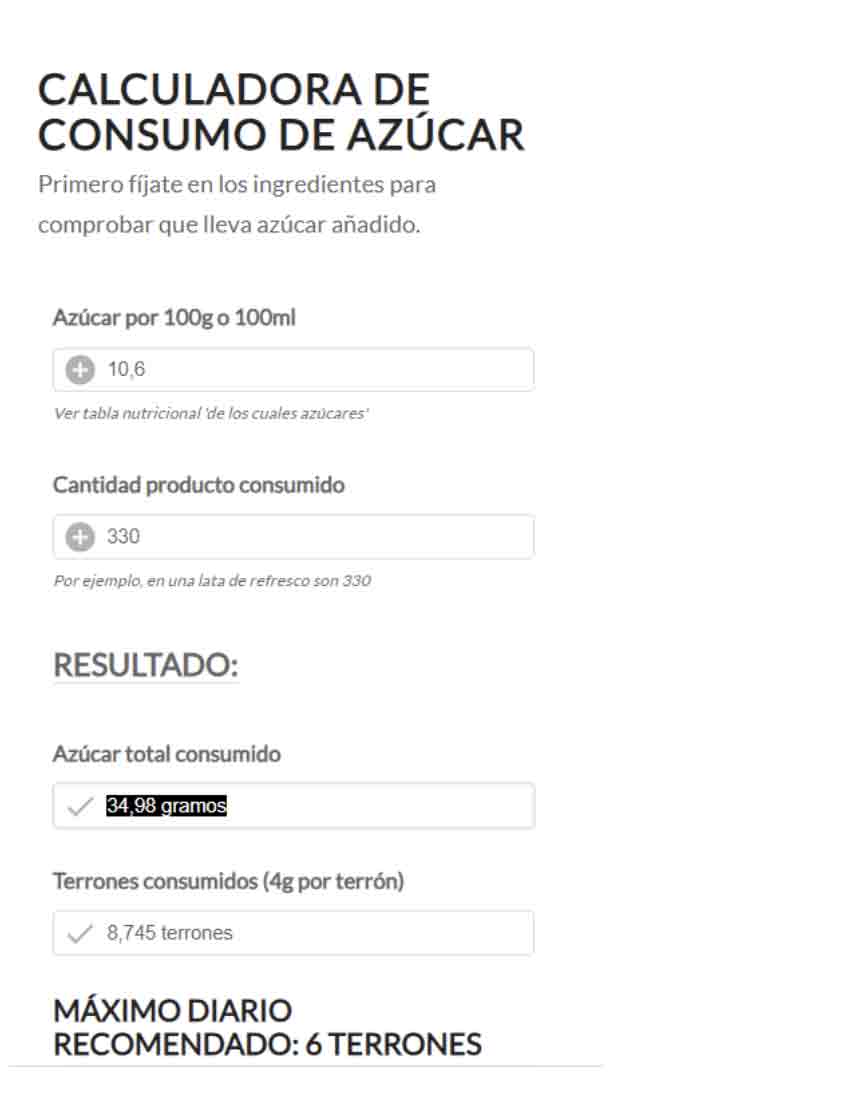 Te ponemos un ejemplo para que veas como funciona. Lo primero es ir al producto que estás consumiendo y buscar en la etiqueta los azúcares, también los ocultos de los que te hemos hablado. En este caso vemos que son 10,6 g por 100 ml, así que ponemos en la calculadora ese dato y después la cantidad que hemos tomado, si es una lata entera, pondremos 330 ml y si es un vaso normal serían 250 ml. El resultado nos da casi 35 g de azúcar que sobrepasa los 25 g diarios que recomienda la OMS para un adulto. Casi 3 terrones más de lo recomendado.
