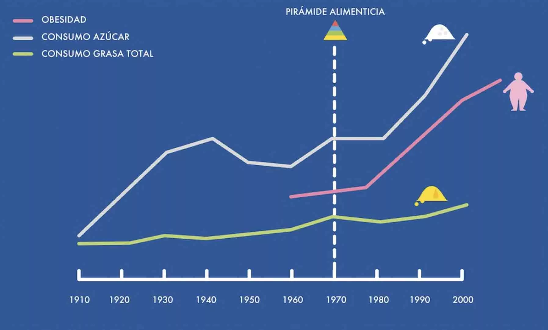 ¿No nos crees? Mira en esta gráfica el escalofriante incremento del consumo de azúcar desde 1970 y cómo se relaciona con la obesidad, más que con la grasa.