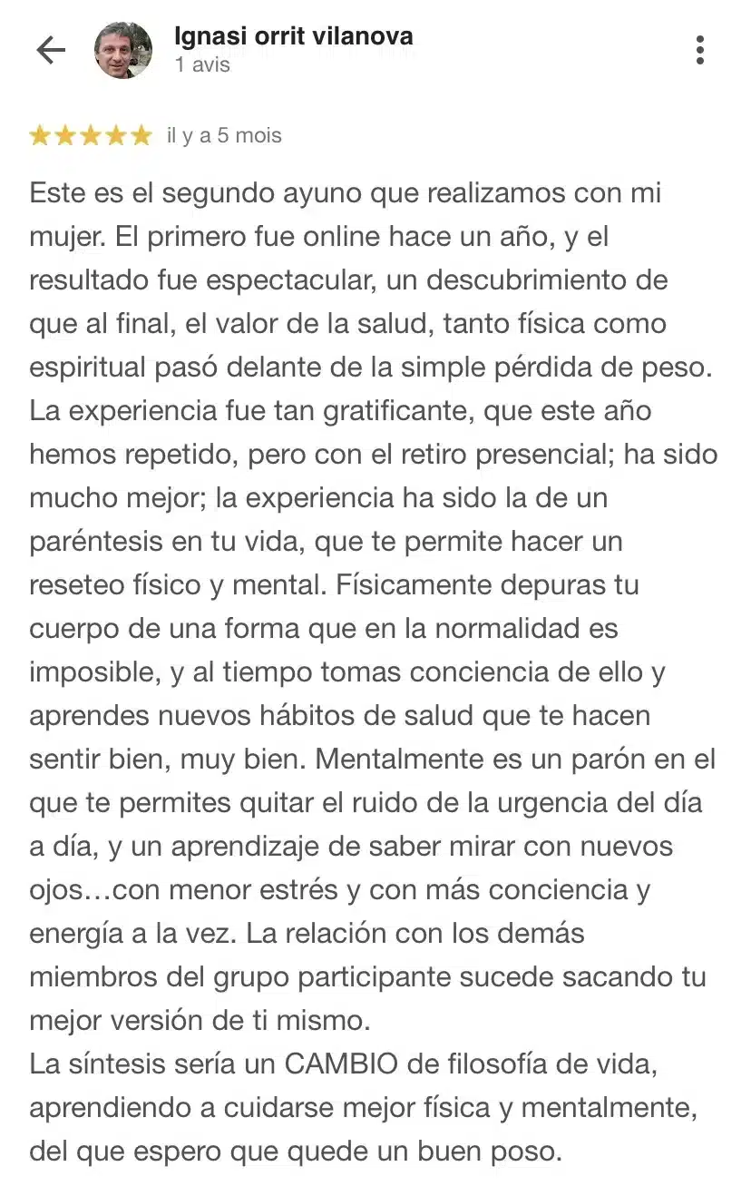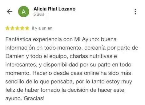 Miles de Ayuneros han finalizado con éxito nuestros ayunos prolongados. Muchos nos regalan palabras maravillosas que hacen que contemos con un 4,9 sobre 5 en reseñas Google de Mi ayuno. Estamos convencidos que tú también puedes lograrlo, tan solo tienes que confiar en nuestro método, profesionales y experiencia.